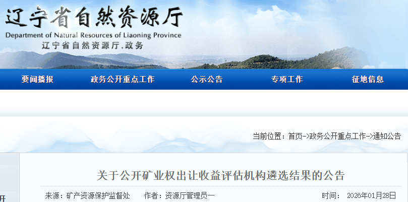 按照《遼寧省自然資源廳關(guān)于公開遴選礦業(yè)權(quán)出讓收益評估機構(gòu)的公告》要求,經(jīng)綜合評定,確定2026年省級礦業(yè)權(quán)出讓收益評估機構(gòu)入圍名單如下,特此公告。